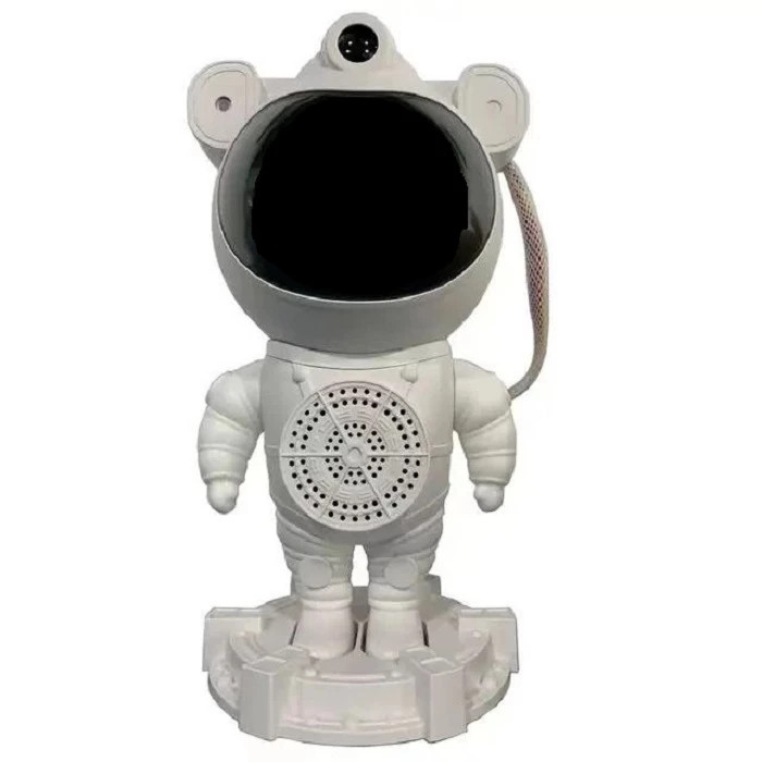 رقص نور کهکشانی طرح فضانورد مدل بلوتوثی اسپیکر دار یک چراغ خواب یا نورپردازی با قابلیت پخش افکت تصویر زنده کهکشانی در رنگ های مختلف به همراه لیزر ستاره ای بر روی سقف و دیوار اتاق یا هر سطح دیگری است که به همراه افکت لیزر ستاره ای حس یک سفر کهکشانی را به شما میدهد . این رقص نور کهکشانی دارای یک اسپیکر بلوتوثی قوی در قسمت پشت سر خود می باشد که میتواند برای شما هر موسیقی را از طریق گوشی یا تبلت پخش نمایید تا بتوانید از آن لذت ببرید. همچنین قابلیت قرار دادن رم میکرو و پخش موزیک از طریق آن را دارا می باشد. تلفیق همزمان تصویر زنده کهکشانی و لیزر ستاره ای و اسپیکر بلوتوثی جذابیت اتاق خواب و یا هر محیطی که در آن قرار دارید را در هنگام شب چندین برابر میکند. این محصول دارای ریموت کنترل نیز می باشد که میتواند تمامی دستور های مورد نیاز از قبیل روشن و خاموش، ولوم صدا، میزان سرعت چرخش موتور، میزان نور پرژکتور یا لیزر را کم یا زیاد و یا برای روشن ماندن محصول تایمر تعریف کنید که سر ساعت مشخص شده خاموش بشود. همچنین قابلیت تغییر موزیک، قطع و وصل موزیک، تغییر مود و حالت های رنگی مختلف را دارا می باشد. این رقص نور جذاب دارای درگاه برق USB Type-c می باشد که می توانید آن را با پاوربانک یا آداپتور موبایل یا هر دستگاه دیگری روشن کنید و هرجایی که دوست دارید استفاده کنید و لذت ببرید. از دیگر ویژگی های این محصول قابلیت هماهنگی ریتم رقص نور با موزیک می باشد که آن را به یک رقص نور جذاب تبدیل کرده و مراسمات و جشن های شما را زیبا و دلنشین تر خواهد کرد