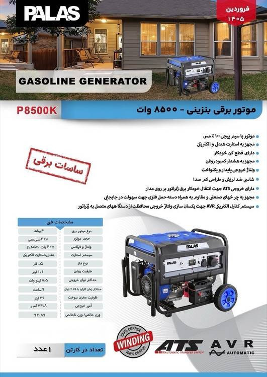 موتور برق بنزینی ۸/۵ کیلووات پالاس مدل P8500Kبرند:PALASتوضیحات: